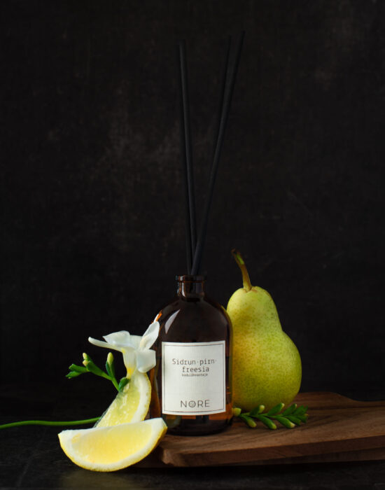 The fragrance includes notes of zesty lemon, juicy pear, and aromatic freesia, creating a unified, fresh, and vibrant fragrance that combines the freshness of citrus, the sweetness of fruits, and the delicate elegance of floral aromas.